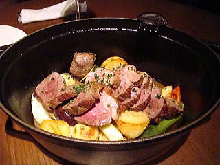 お店のホームページで、おすすめ料理に子羊のローストを発見!二度目の訪店です。おすすめの白ワインで乾杯!前回同様に黒板メニュー登場。おすすめはゴン鯵と水なすのマリネ。脂がのった鯵にアボガドがからみ、濃厚ながらさっぱりした味わい。お目当ての子羊は大きなストウブで登場。お肉と野菜の量にびっくり!薄い塩味で、マスタードでいただきます。出汁のしみた野菜がこれまた美味。満足のひと皿。鴨胸肉のローストも注文したのですが、注文時にお店の方から保留の提案が。正解(笑)。ココナッツのブランマンジェでお腹を整えてごちそうさま! 料金は税込サービス料なし。別途席料@600円