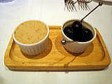 豚のリエット・オリーブ。パン。アミューズのアスパラ、ごぼうを土に見立てています。前菜アップ(雲丹がたっぷり)