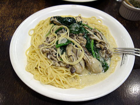 カキとホウレン草の生クリームソース 1400円 大粒な牡蠣が5個、家庭でつくれそうだけど、つくれないんですよね。