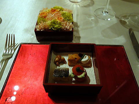 漆の重箱で供されたアミューズ。左上の小さなアンチョビのクロワッサンが印象的