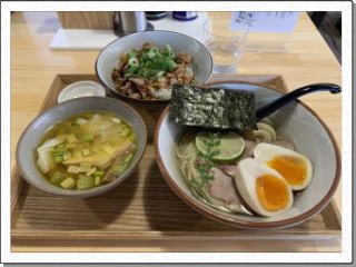 平日の昼時に訪店。待つことなく入口の券売機で食券を購入。サイドメニューがサービスになる特製昆布水つけ麺を注文。サイドメニューはミニチャーシュー丼を選択。エッジのきいた細麺は最初は塩でいただき、次につけ汁で、最後にライムで味変していただきました。みずみずしさを感じ、麺を食べてる満足感に溢れたつけ麺かと。ランチセットのミニチャーシュー丼はつけ麺と相反して濃いめの味付け。淡麗なつけ麺とのバランスは良好。たしかこのお店って以前もラーメン店だったような。
