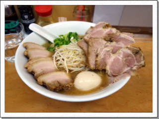 上尾市内で移転後3度目の訪店。本日も前回同様に2種類のチャーシューが迫力の特製肉そばをいただきました。まろやかな醤油味の豚骨系のスープは口当たり良好。麺はハリがあって、固めに茹であげられた細麺。細いもやしのシャキシャキ感が良いアクセント。この後、スポーツクラブで運動するからと自分に言い聞かせましたが、高カロリーの一杯でした。