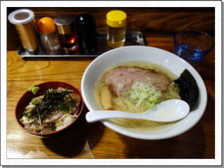 本日は新車の慣らしを兼ねて赤城山へ。早起きして赤城山のクネクネ曲がった道をドライブ。帰り道のランチで訪店しました。ランチタイムにはお得なセットが数種類。ラーメン店では珍しい鶏タタキ丼のセットを注文。まずは塩らあめん。ものすごい旨み。鶏出汁と鶏油の絶妙なハーモニー。スープとからみにくいタイプの自家製麺ですが、相性は抜群。鶏タタキ丼は焼鳥専門店並みの出来栄え。これで860円はバーゲンかと。