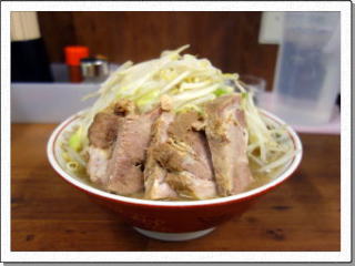 7回目の訪店。最初の訪店が2004年だから、かれこれ16年前のこと。今では黄色の食券を渡すときに、麺少な目のコールを。完成前には野菜マシのコール。厚切り豚5枚にもやしの山。食べるものを冒険者にするルックス。見事です。麺少な目にしたせいか、もやしと豚がメイン。それでも二郎は唯一無二の二郎でした。ごちそうさまでした。