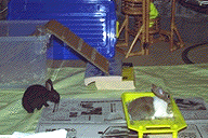 我が家に来て約3週間目、体重測定をすると、うーは530g、くーは380gでした。ベランダにあったチンゲン菜と小松菜のつまみ菜をあげたら、美味しそうに食べました。 運動場の一面を開けて、うーとくーを初めて外出させました。くーは、畳の上を走り回りましたが、うーは腰が引けてびくびくしていました。 くーはある日、後ろ足で「トーン」と何度も大きな音をたてました。何の危険を知らせたのかさっぱり分かりませんでした。うーも同じ頃初めて一度だけトーンとしました。 |