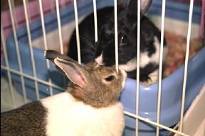 我が家に来て約1カ月、うーがくーを噛んで以来、くーは「キーッキーッ」と大きな声で泣いたことを忘れませんでした。でも、隣同士で暮らしているうちに過去の記憶はうすらいでいったようです。 うーは、外で遊ぶとき必ずくーのところに遊びに行きます。そしてサークルの隙間に顔を突き出してじっとしています。そうすると、くーがうーのおでこをぺろぺろと舐めてあげるのです。 |