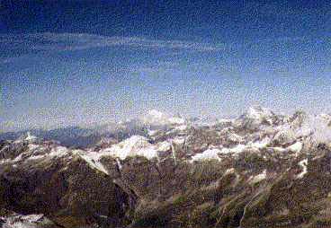 今日は、午前中に来たお陰で天気が崩れるまえに登ることができ、ごらん のように、何100kmも離れた、ユングフラウヨッホやモンブランがきれいに 見えました。