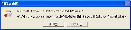 しかしいくつか問題がありました。 私のVAIOは Office XP がインストールされていたので、デスクトップ には Outlook のアイコンがでています。これを削除しようとすると 以下のようにいろいろうるさいメッセージがでてきます。