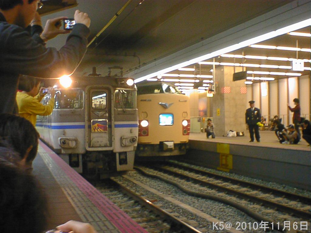 17:10着の「特急はまかぜ4号」と17:12発の「特急雷鳥33号」が並ぶ。「特急雷鳥号」はもう1往復しか残っておらず、来春には廃止される予定である。こちらも貴重な存在であり、「古豪キハ181系 はまかぜ」と「国鉄色485系 雷鳥」の並びも重要な祭なのだ。私ははじめ
