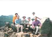 山頂からの眺めは絶景。三ツ峰から硫黄山への稜線が一望、両側に雲海が広がる。来て良かった。そしてこのあとの稜線歩きが楽しみになる。下山開始した瞬間、羅臼平で休んでいるはずのT氏とつきそいのM氏とでくわす。6人揃っての記念写真となった。