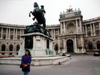 ←ノイエブルグ(新王宮)の前で。ウィーンの建築物は、壮大で、又、敷地も広いので、「あっ、あれいいなあ!」と思って、歩いても歩いても、なかなか建物の近くに行けません・・・・。