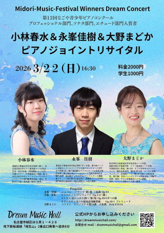 このジョイントリサイタルは、第12回なごや青少年ピアノコンクールのプロフェッショナル部門、ソナタ部門、エチュード部門入賞者の方々のためのリサイタルです。