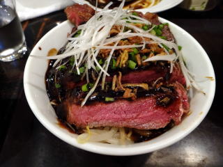 3年9カ月ぶりにランチで訪店。以前と変わらない店内は、掃除が行き届いていて、とてもキレイな隠れ家のよう。12時をすぎると階段は待ち客で行列。ランチメニューは、鶏、豚、牛肉を使った丼物や一品物の定食が数種類ありました。東京ブラックカレーは、甘くて辛い複雑な味。途中から玉子の黄身を混ぜるとマイルド感がアップ。3品で一番のお気に入り。ハンバーグはガラムマサラ風味。というか羊肉でしょうか。ビフテキ丼は見た目通りの安心感のある美味しさ。ご近所のビジネスマンは幸せです(笑)