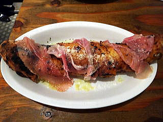 ストラッチーノチーズ(カビたものがゴルゴンゾーラ)をピザ生地で包み生ハムを添えたもの(メニュー外)¥1000