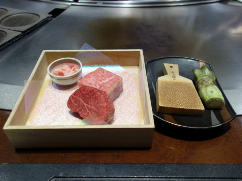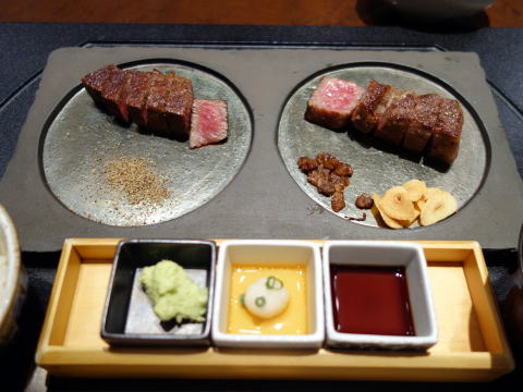 黒毛和牛のヒレとサーロイン わさびは鮫肌でおろします