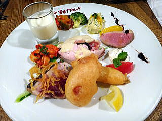 本日の前菜盛り合わせ。海老のフリットが美味。次回の前菜はフリットにしようかと(同行者)