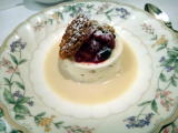 キャラメルとナッツの冷菓”ヌガーグラッセ”。コーヒー。小菓子。夜に映える白い壁のレストラン