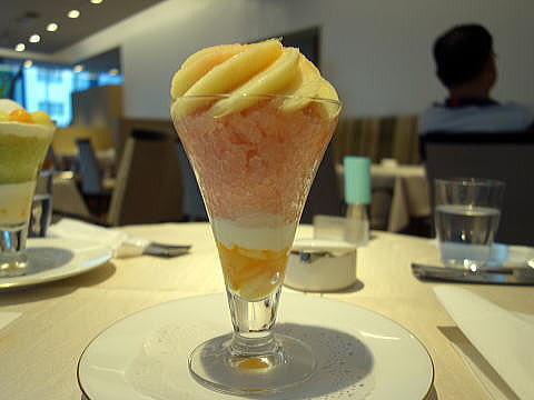 きれいにカットされた白桃にソルベ、シャリッとしたグラニテに生クリーム、バニラアイスクリームの構成。今年の桃は去年ほどの甘さはなかったような