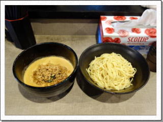 3回目の訪店です。2種類ある担担麺は制覇しましたので、今回はつけ麺を注文。ちなみに担々麺は赤のほうが好み。つけ麺は初級ステージの護摩龍つけ麺。つけ汁はペースト状のもので、ひき肉とホウレン草が満載。丼が大きいです。麺は平たい中太のもので、つけ汁とのからみは良好。大盛無料サービスですが、他のつけ麺店の並盛程度。女性でも大盛にしたほうがよろしいかと。次回はステージアップして辛さ倍増です。