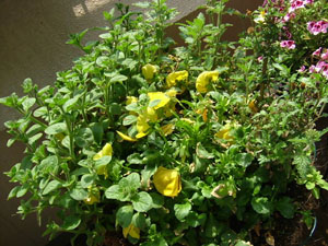 | まだ、サフィニアには虫が付いていない様ですが、他のパンジーにはたくさんのアブラムシが。 そこで、オレートを散布しました。(2004.5.16) 虫が出てくる季節なので、木酢液をまきました。(2004.5.9) ほぼ満開になりました。(2004.5.8) サフィニアの花が咲きました(2004.4.26) サフィニア苗を植木鉢に植えました。(2004.4.10) 2004年産のサフィニア苗を買ってきたのですが、植える鉢をどうするか迷っています。(2004.3.28) ようやく春ですね。(と言っても昨日は雪が降りましたが)そろそろサフィニアの苗が出回ってきそうですネ。 今の時期のサフィニアは、鉢に植えた後、花芽が出ても心を鬼にして摘み取るのだそうです。そうして葉が鉢一杯にするとたくさんの花がキレイに咲きほこる様になるそうですよ。 さすがに、うちのサフィニアも花は終わっています。でも、枯れてはいないので今年も花を咲かせてくれるのでしょうか。(2004.3.21) サフィニアのパーム鉢でようやくパンジーの花が咲きました。(2004.1.22)