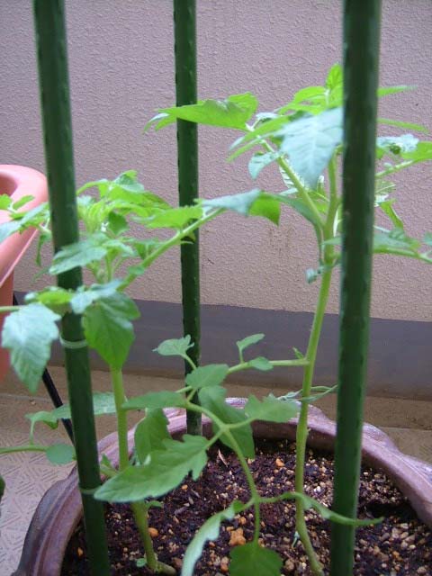 | 購入してきたミニトマトの苗を大き目の鉢に二株植えました。 |