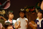 あんずもよく分からずプーさんの耳を付けさせられてます。 |