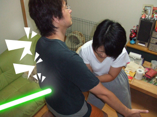 ナカジ:ダークサイドの力を思い知るが良い、はっはっはぁ〜 ヒトミ:暗黒面の力など取るに足らんわ! ナカジ:よく言った、今日こそ牛肉は私の手に!とりゃぁー ヒトミ:行くわよー リンゴ:早くしてね! |