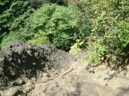 これも上と同じ場所を下から撮影したもの。登山靴ではしっかり足をグリップさせることが難しかったです。登山靴はソールが厚く、足でしっかり踏めている感覚がないんです。ここの少し前、足を滑らせてプチ怪我をしました。鎖は両手で持つと体を左右に振られて危険です。でも片手で掴んでいた場合、墜落を止められるでしょうか?僕は咄嗟にもう一方の手で鎖を掴み墜落を防ぎましたが、鎖と岩に手を挟まれて痛かったです。変な落ち方をしたら手を離してしまう可能性もあるでしょう。クライミング技術を磨かなくちゃいけませんね。 |