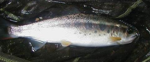 そのまま、餌を流す。ガツンとアタリがあり、竿を立てるスペースが上にないので、横に竿を振りあわせた。そいつは上流に向かって5mは走ったろうか、もちろん一緒に付いていったが、中腰なので辛かった。