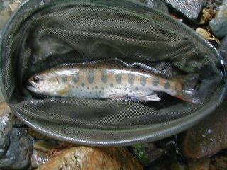 10分ほどでやっと流れに出会う。だがこの辺りはせせらぎになっちゃってて釣りにならない。上流に行くか、下流に行くか悩んだが、そのまま下ることにし、作業小屋を越え林道を歩いた。まだ水量が少ない中、落ち込みが一つだけあった。ひょいと餌を振り込む。途端に心地よいアタリがあり、17センチのヤマメが上がってきた。ここまで苦労した甲斐があるもんだ。もちろんリリース。