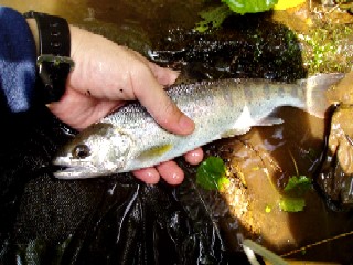 残念なことにここは蜘蛛の巣だらけだった。あまりの蜘蛛の巣攻撃にモチ切れになり、なえかけた時にまたまた堰堤が現れた。今度はでかいプールがある。 「堰堤ではいい思いしたことがないんだよなあ」と思いながらも丁寧に攻めてしまう私。 数投目にあったアタリもまたどうせカワムツ君だろうと思うと以外に重い手応え。取り込むのに苦労しました。 |