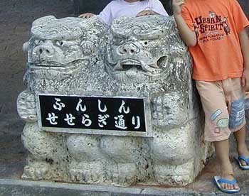 通りの入り口にある門標。シーサーの2体がセットになっている。