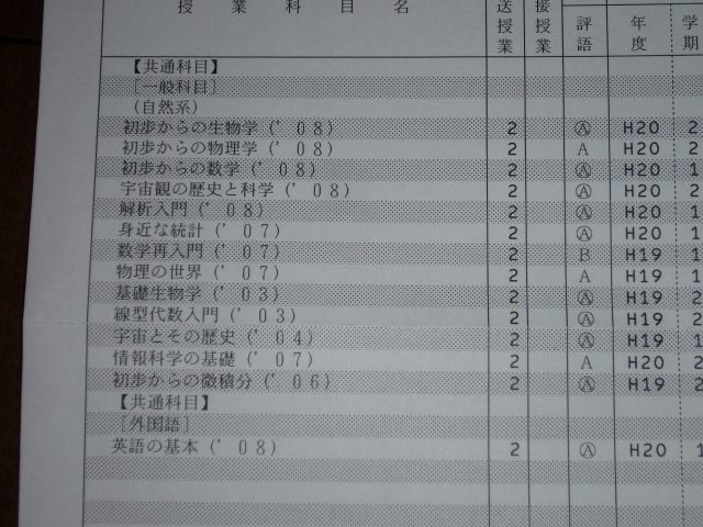 放送大学の単位認定試験の結果が送られてきました。専門科目を選択して申請した時、専門科目の受講を認められませんでした。そこで、共通科目を30単位とらないと専門科目を受講できないと思い込んでしまいました。しょうがないので、2年間で同じような科目を受講していました。事務所に確認したら、試験時間が重なった時は、共通科目の方が優先されるとの返答をいただき、授業科目案内で確認したらその通りでした。そのためか、今回は丸A(90〜100点)への執着はありませんでした。共通科目で受講したい講義は無くなったので、21年度は専門科目を受講します。あと2年位は楽しめそうです。
