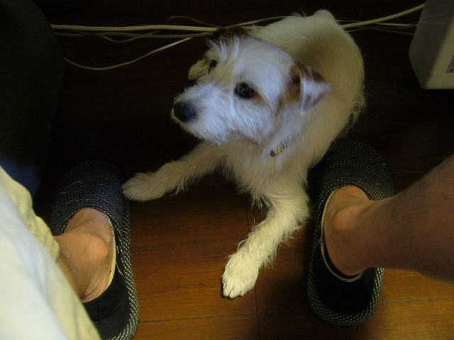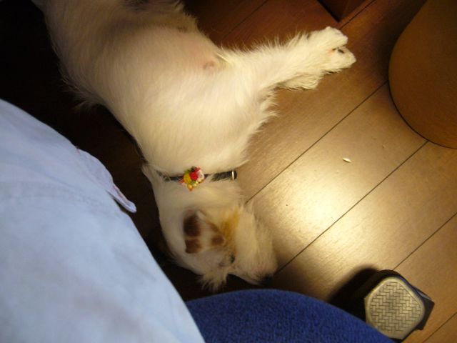 机で本を読んでいると、桃子は暑いのに私の足元に来ます。そしてしばらくすると、静に寝てしまいます。1時間位で目を覚まします。それからは、元気になりいたずらが始まります。紙を噛みちらしたり、ゴムのドアストッパーを齧ったりしています。退屈で口寂しいのかもしれません。
