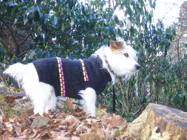 この冬、3枚目の服はとっくりのセーターです。1枚目は袖(前足が出る穴)、2枚目は背中が破れました。このセーターも2日目には袖の毛糸がほつれてしまいました。桃子が自由に使えるのは口しかありません。口には犬歯があり、それを使って服を脱ぐのですから服が破れるのもしょうがないなあとあきらめています。桃子にとっては「口が手」です。