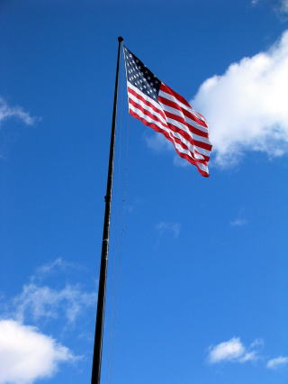 右)アメリカ国旗がはためく。ハンパでないデカさ。