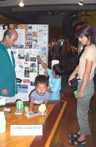 ブースに帰ると工作コーナーでは、写真上右、下の2枚の写真のように、「ほたる」作りを楽しんでいるお子さんがいらっしゃいました。火傷には気をつけてくださいね!