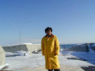 天気は良いが、なまら寒いっ!見ての通りの完全防寒、パラシュートパンツ・フリースベスト・スリッカーコート・
