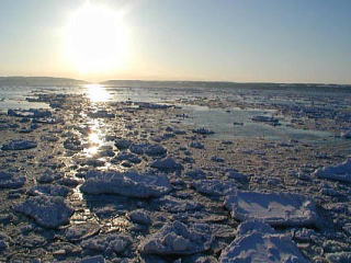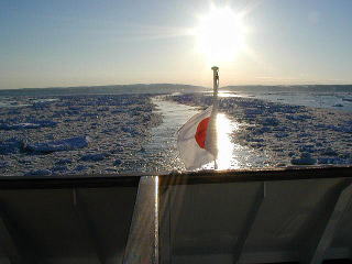 デッキに出て、海上を見ると白とも薄青ともとれる流氷が浮いている。