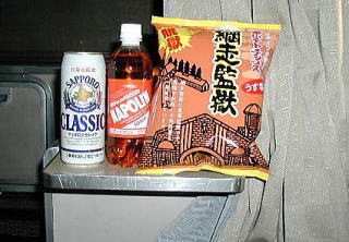 ローソンでつまみを買って、寝台で寝酒。ビールはサッポロクラシック、ジュースはリボンナポリン、極めつけは