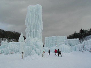 湖畔エリアに林立する氷涛は、鉄柱を組んだ土台に支笏湖の水を汲み上げて凍らせたものである。