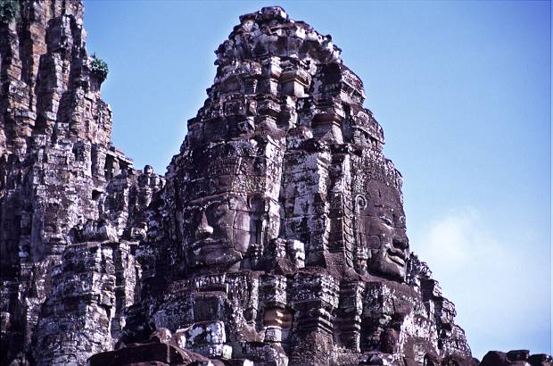 これが最も有名な、“クメールの微笑み”といわれる菩薩の4面仏。ロープが張ってあった。 撮影:02年11月 草が生えているものもあり。 撮影:02年4月 上部テラスには、このような4面仏がたくさんある。 撮影:02年11月