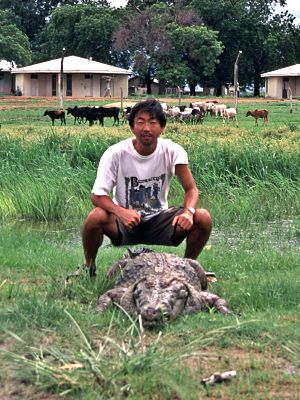 この池の管理人らしき人(この人に入場料を払った。)が来て、「ホワイトマン、カモーン!」と叫んだ。ホワイトマン? 私以外は、観光客も含めすべて黒人だ。私しかいない。行くと、「このワニの上に座れ。」という。そして、写真を撮ってやるからといってカメラを持っていった。たくさんの人が見ているし、せっかくだからとトライ。しかし、お尻をワニの背に着けることは恐くてできなかった。