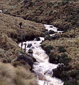 | この急流を渡らなければならない。写真左上は、急流を見てたたずむピーター。 | マッキンダース・バレー |