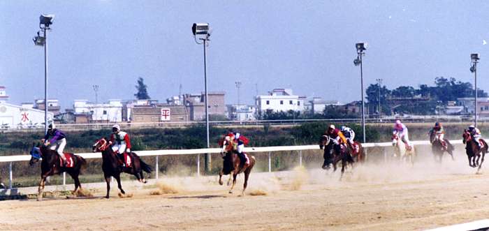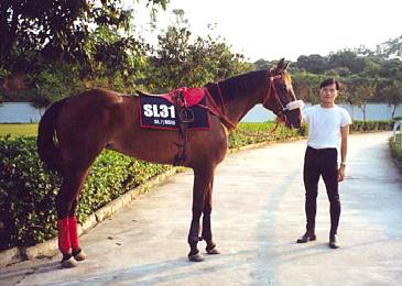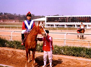 | 下の3枚の写真は、Mr. Lam が、2001年5月に GuangZhou 競馬場で行われたレースに、中国馬で出場したときのものです。結果は5着でした。 |