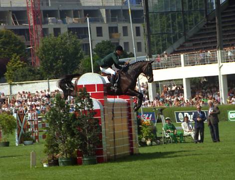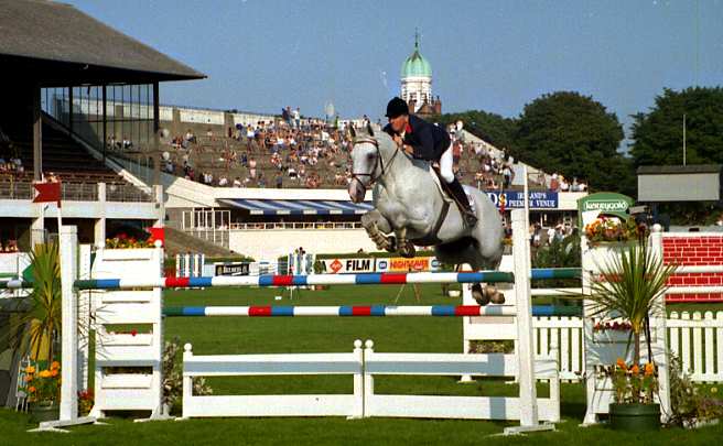 | 1995年8月のダブリン滞在中、街中いたるところに「ホースショー」のかんばんがあった。このかんばんの矢印にそって進んでいくと、ホースショーの会場に到達する。 ここに来るまでよく知らなかったが、このイベントはアイルランドで最も大きなイベントのひとつであり、1週間にわたって乗馬の競技が行われ、ヨーロッパ全土から競技者と馬が集う。 アイルランドチーム,選手が優勝すると、翌日の新聞の第1面はその記事で埋まっていた。 |