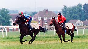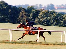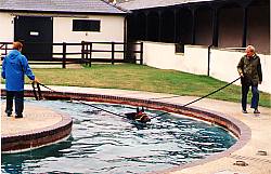 | ニューマーケットには競馬博物館があり、ツアーを開催している。博物館の入場料と、朝の調教見学,厩舎訪問,国立種馬場見学がセットになっている。丘陵での調教見学は、べつにツアーに参加しなくてもできるが、厩舎訪問と施設を使用したトレーニングは、ツアーに参加しないと見れない。 右の写真は、プール調教の1シーン。 |